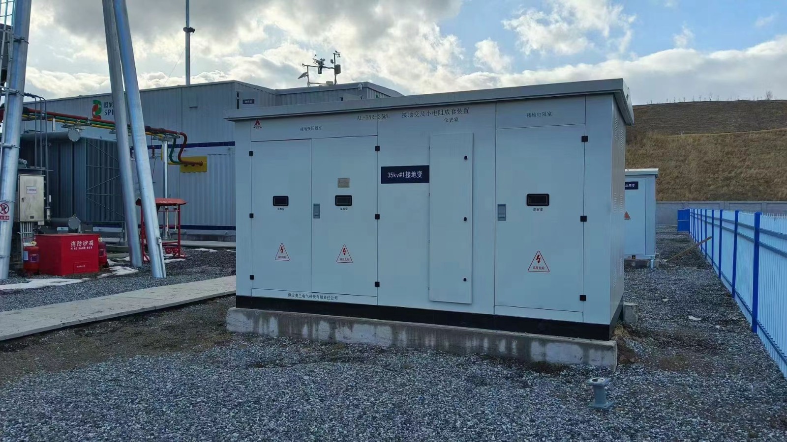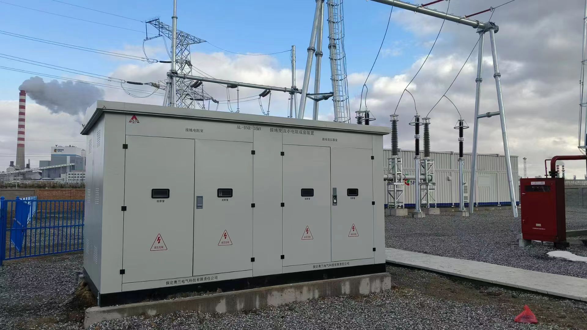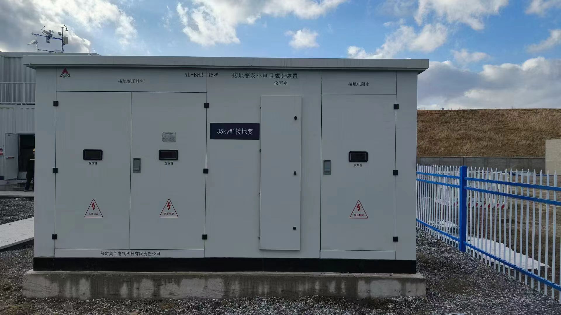 此項目為國家電投內蒙古白音華自備電廠可再生能源替代工程300MW光伏項目,奧蘭電氣所供產品為35KV接地變小電阻成套裝置,其中接地變的容量為2200KVA,不帶站用變,小電阻值為1000A,零序電流互感器為干式1000/1A,共2個二次繞組:保護級5P20;容量15VA裝于接地電阻柜內,單相隔離開關1組40.5kV,1000A,31.5kA(4s)。智能監(jiān)控器1套。戶外冷軋鋼外殼,防護等級為IP54 。包含電纜固定支架、電纜卡、或穿墻套管、測溫元件、溫濕度控制、風機等任何元件或裝置等其他附件。此產品圖片為送電前期我公司現(xiàn)場服務人員所拍攝。